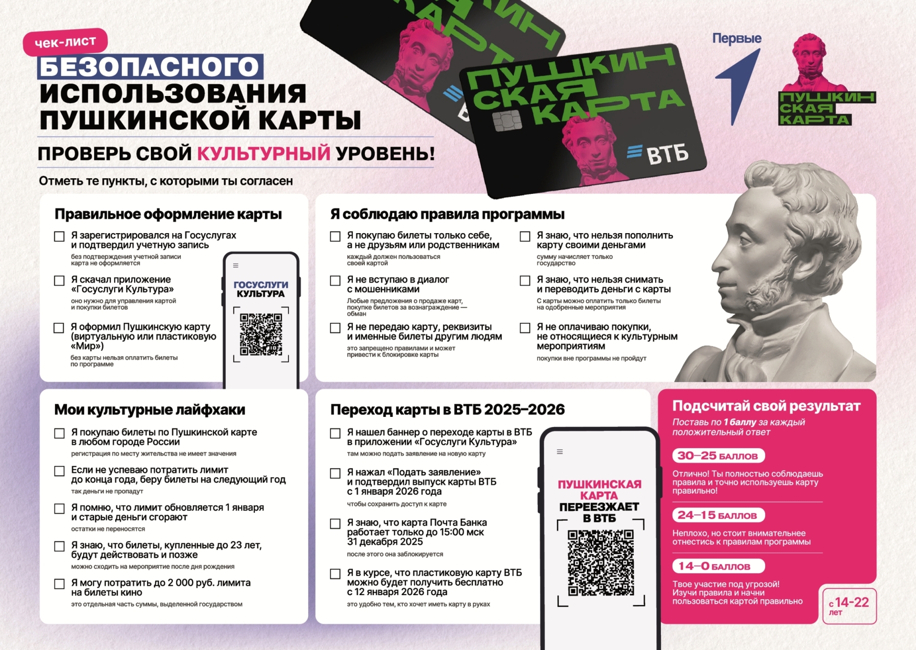 Общероссийское общественно-государственное движение детей и молодежи «Движение первых», в рамках реализации Десятилетия детства в Российской Федерации, подготовило памятку для самопроверки знаний молодых людей по безопасному и грамотному использованию карты программы «Пушкинская карта».