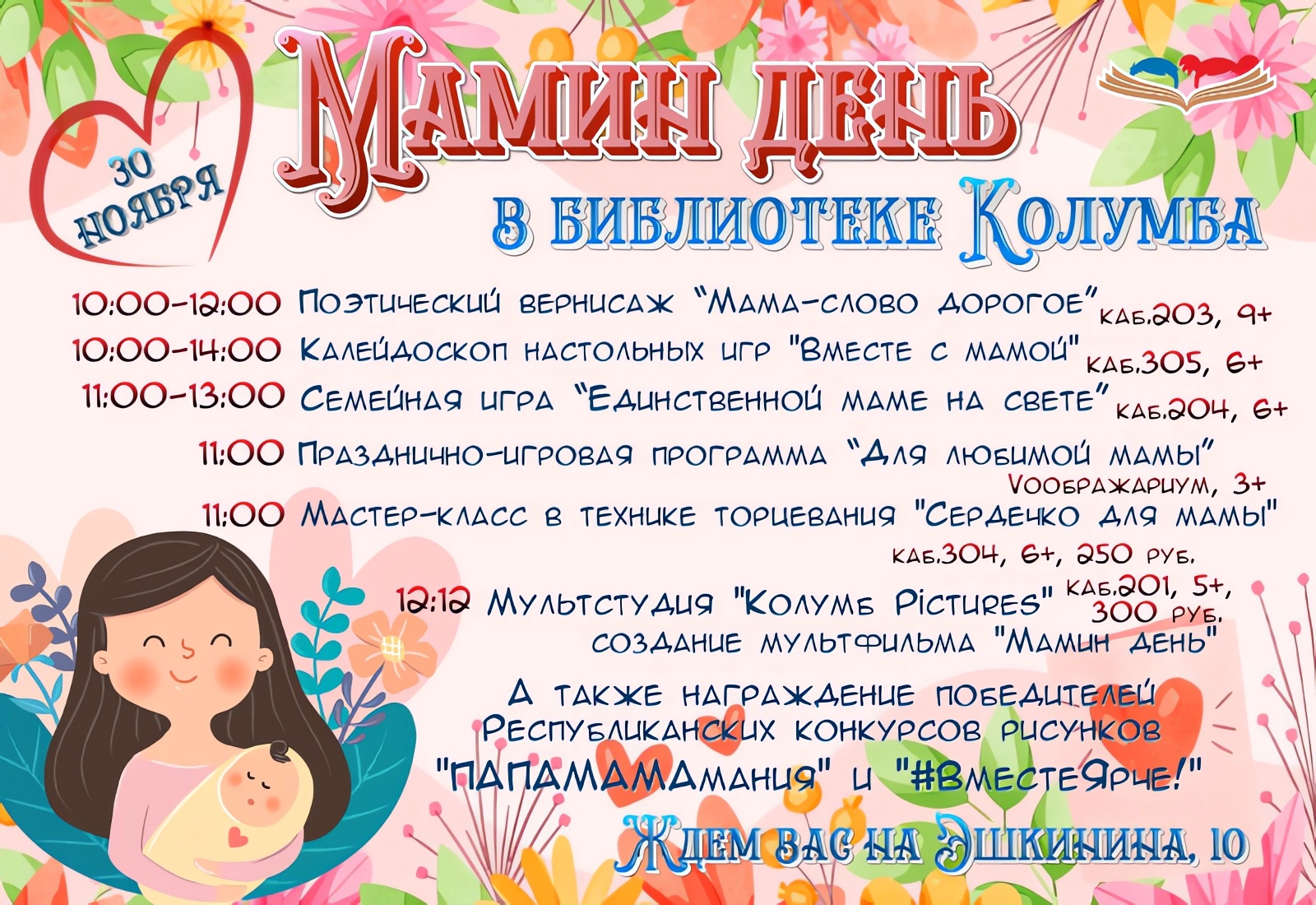 День матери — особенно душевный праздник, который посвящен самому дорогому человеку – маме. Её любовь, забота и тепло сопровождает нас всю жизнь. В преддверии праздника, который отмечается в последнее воскресенье ноября, в отделе художественной литературы и искусств оформлена выставка – посвящение «Мамам, мамочкам, мамулям!»