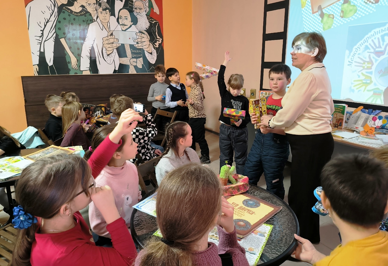 Учащиеся младших классов школ города узнали об истории праздника и существующем многообразии языков. В игровом формате они познакомились с некоторыми буквами славянской азбуки, рассматривали яркие детские книги, написанными буквицей и тренировались в произношении скороговорок. Используя красочные буквы русского алфавита, дети придумывали слова и соревновались в создании веселых рассказов. Юные читатели с удовольствием отгадывали загадки, составляли коллажи, разгадывали иллюстрированные ребусы и играли в «Словобор» и «Найди пару».