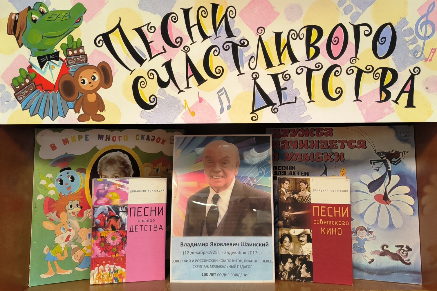 Юбилею композитора в отделе художественной литературы и искусства посвящена выставка «Песни счастливого детства». На ее полках представлены сборники нот и текстов песен, созданных в сотрудничестве с такими выдающимися поэтами, как Юрий Энтин и Эдуард Успенский. Здесь представлены музыкальные сказки и грампластинки с записями песен. Особое место занимает книга Ирины Кошминой «Владимир Шаинский и его песни», которая подробно рассказывает о жизни и творчестве композитора.