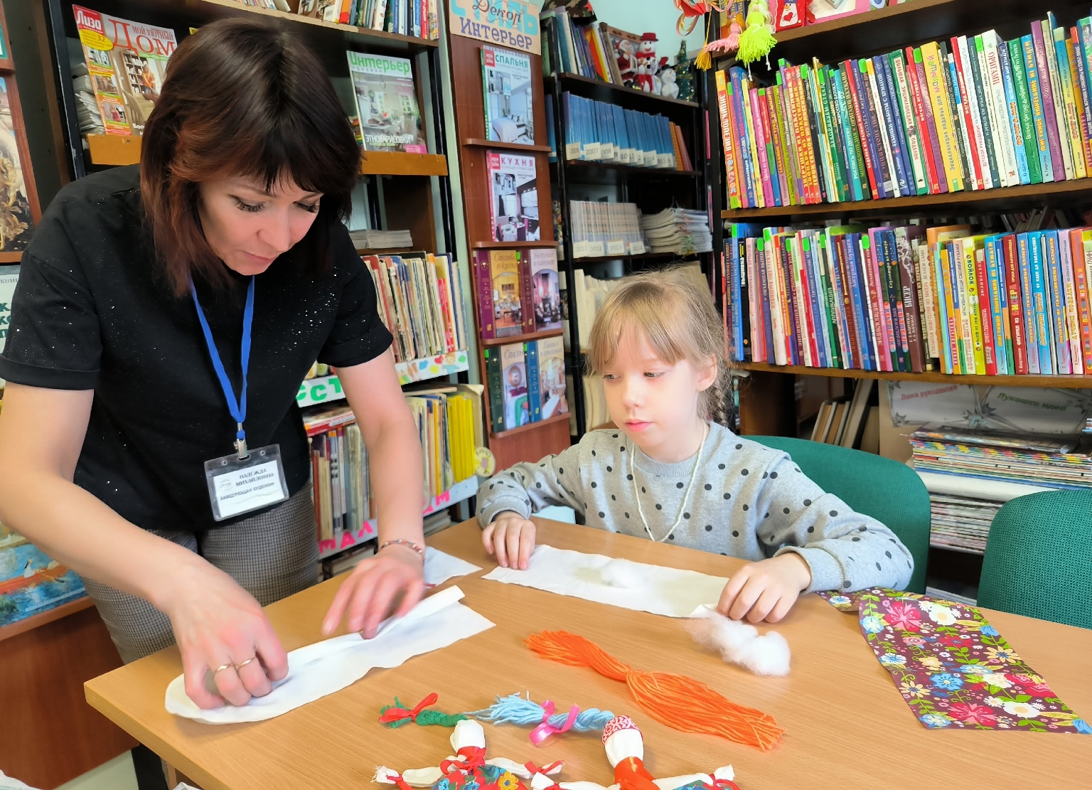 В рамках ежегодной всероссийской акции «Неделя детской книги» для юных читателей библиотеки прошел мастер — класс по созданию кукол-мотанок «Русская красавица». Ребята не только творили своими руками, но и познакомились с традиционным русским народным творчеством, проявили интерес к истории и культуре родной страны.