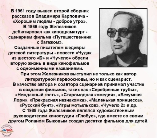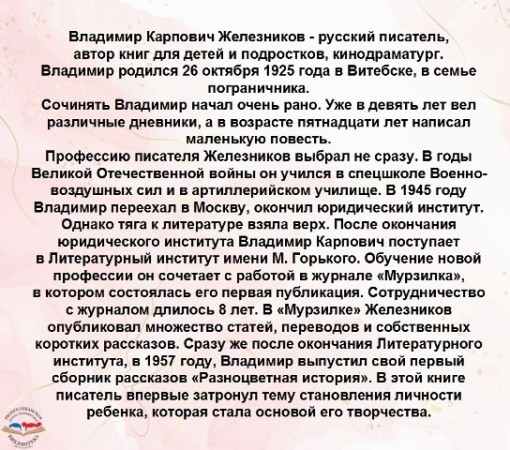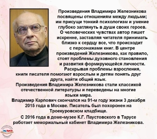Произведения Владимира Железникова посвящены отношениям между людьми; им присущи тонкий психологизм и умение глубоко заглянуть в души своих героев. О человеческих чувствах автор пишет искренне, заставляя читателя принимать близко к сердцу все, что происходит с персонажами книг. В центре произведений Железникова, как правило, стоят проблемы духовного становления и развития формирующейся личности. Раскрывая проблемы взросления, книги писателя помогают взрослым и детям понять друг друга, найти общий язык. Произведения Владимира Карповича стали классикой отечественной литературы и переведены на многие языки мира.