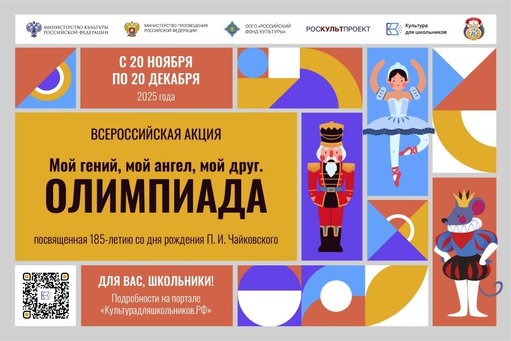 С 20 ноября по 20 декабря 2025 года в рамках межведомственного культурно-образовательного проекта «Культура для школьников» пройдет всероссийская акция «Мой гений, мой ангел, мой друг. Олимпиада», посвященная 185-летию со дня рождения величайшего русского композитора П.И. Чайковского.