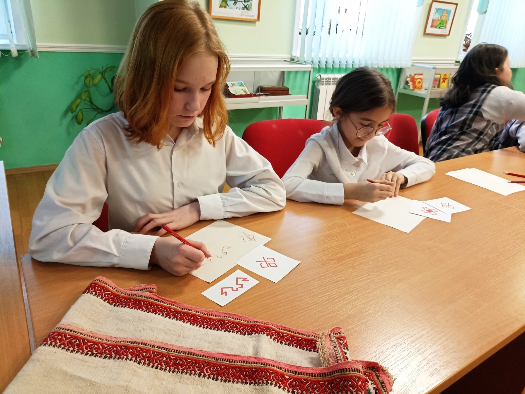 Особенно впечатлил ребят рассказ о геометрических знаках — тиште и тамге, служивших символами принадлежности к семье или роду, а также использовались для записи информации, долгов и других важных данных. Каждая семья имела свою родовую метку – тамгу, которая отражалась в вышивке одежды. Такие знаки применялись влоть до конца 30-х годов XX века. Детей поразило, что по вышивке можно было понять, из какой местности человек и к какому роду принадлежит. Они с удовольствием рисовали геометрические знаки – тиште как элементы марийского орнамента. Встреча получилась очень познавательной и интересной, участники согласились, что День марийской письменности играет важную роль в сохранении культурной самобытности народа мари и языкового многообразия России.