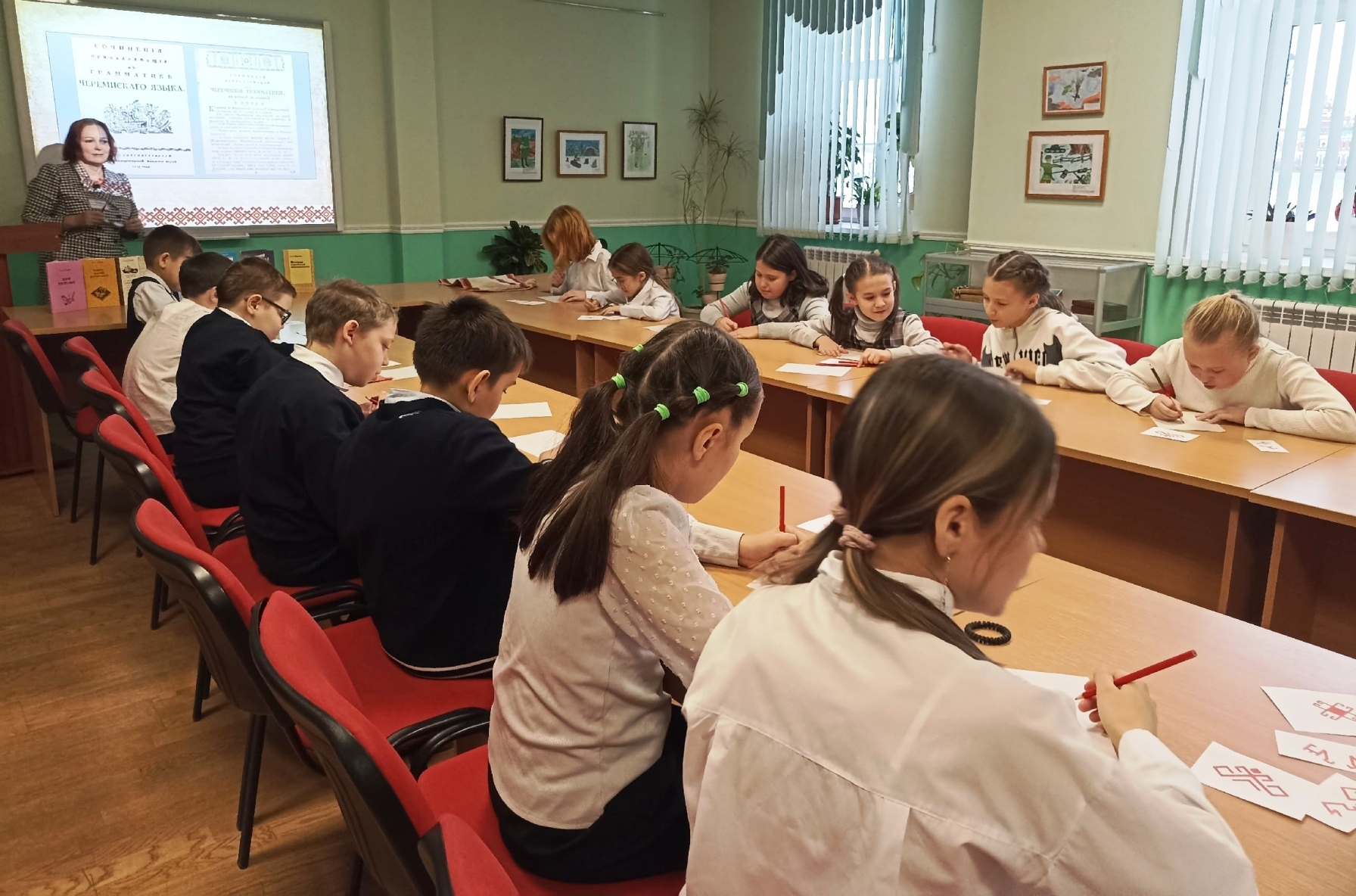 В День марийской письменности в библиотеке состоялся краеведческий час «Есть в истории нашей страница», посвящённый истории праздника. Учащиеся из средней общеобразовательной школы №2 узнали, почему именно 10 декабря отмечается День марийской письменности, познакомились с историей зарождения марийской письменности, на кадрах мультимедийной презентации увидели первую марийскую грамматику и ранние тексты народа мари. Они также узнали об известных марийских учёных, которые внесли значительный вклад в развитие современного марийского языка.