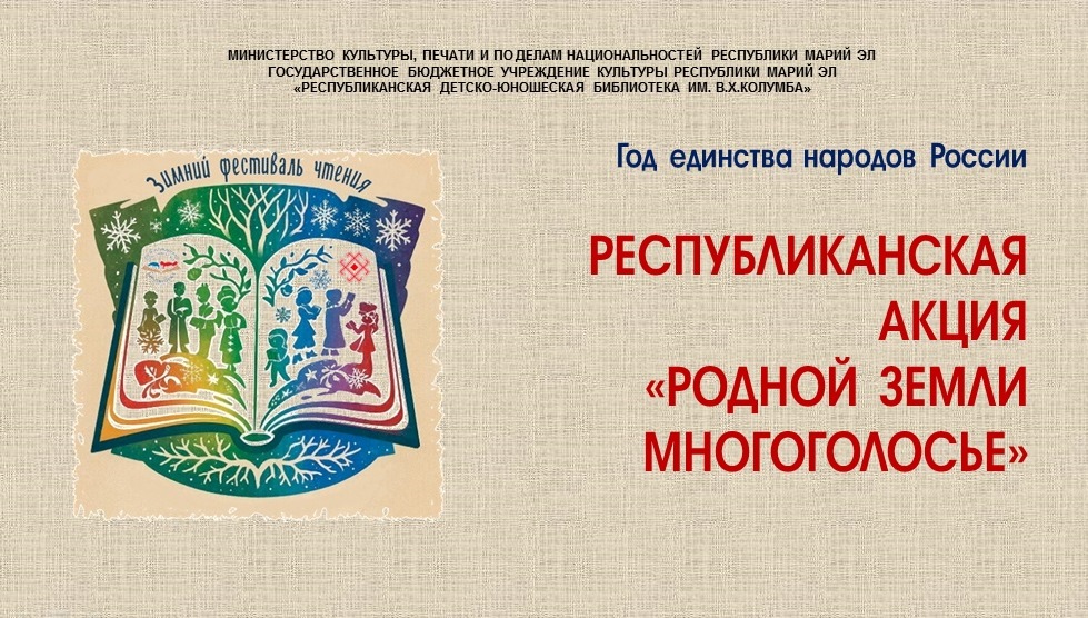Республиканская детско-юношеская библиотека им. В.Х. Колумба приглашает специалистов муниципальных и школьных библиотек Республики Марий Эл, работающих с детьми и молодежью, принять участие в республиканской акции «Родной земли многоголосье».