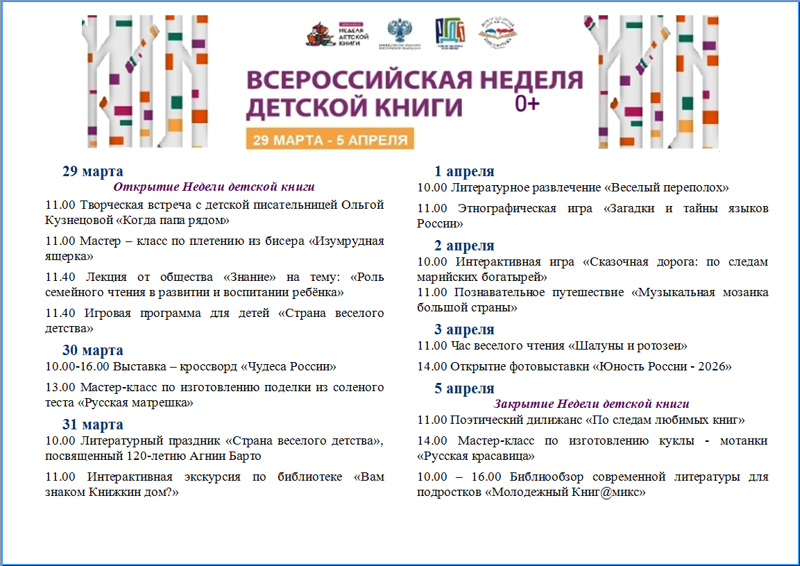 Совсем скоро стартует масштабная ежегодная всероссийская акция «Неделя детской книги»! В этом году она посвящена Году единства народов России. В нашей библиотеке акция стартует 29 марта — ежедневно для читателей библиотеки будут проходить встречи, лекции, праздники, игры, обзоры литературы, мастер — классы и многое другое.
